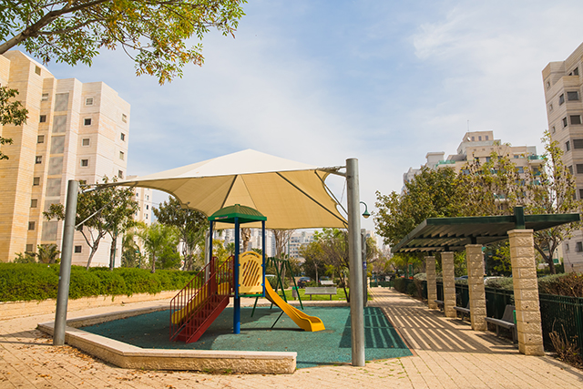 בגינה יש מתקני שעשועים מוצללים לילדים – להנאת תושבי השכונה.​