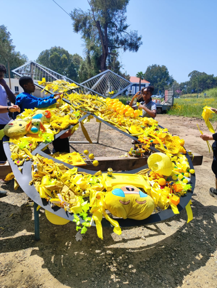 השבוע כבר החלו תלמידי בתי הספר אלדד וטשרניחובסקי, בהנחיית מורי האמנות שלהם, למלא את הפסל בבדים, כלים, פסולת ממוחזרת וצעצועים, כולם באותו הצבע.​