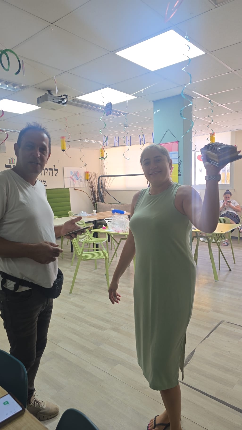 לשם כך דאגנו לכל פרט: הבאנו כיסאות למבוגרים ולילדים, סידרנו שולחנות יצירה, שולחנות משחק, ופינת כיף והנאה ובה דשא סינתטי, פופים, ספרים, ומשחקי הרכבה. בנוסף, דאגנו לכיבוד ולשתייה – כדי להעניק לתושבים רגע של נחת, בתוך התקופה המורכבת הזו.