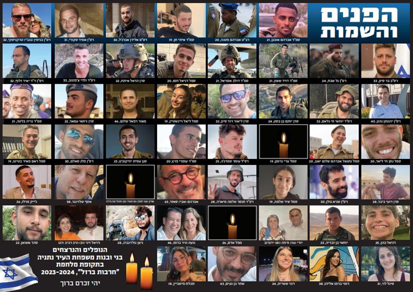 בכניסה לביה״ס תשרי הוצבו דגמים המתייחסים לחטופים, משפטי השראה, נרות זיכרון ותמונות של נופלי העיר נתניה.