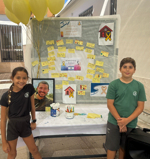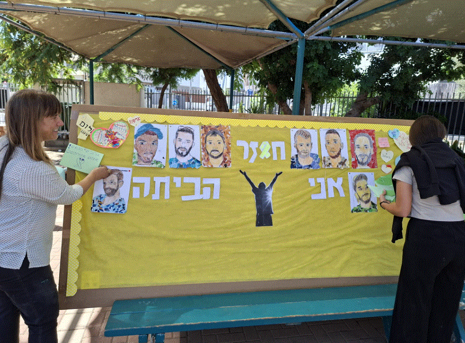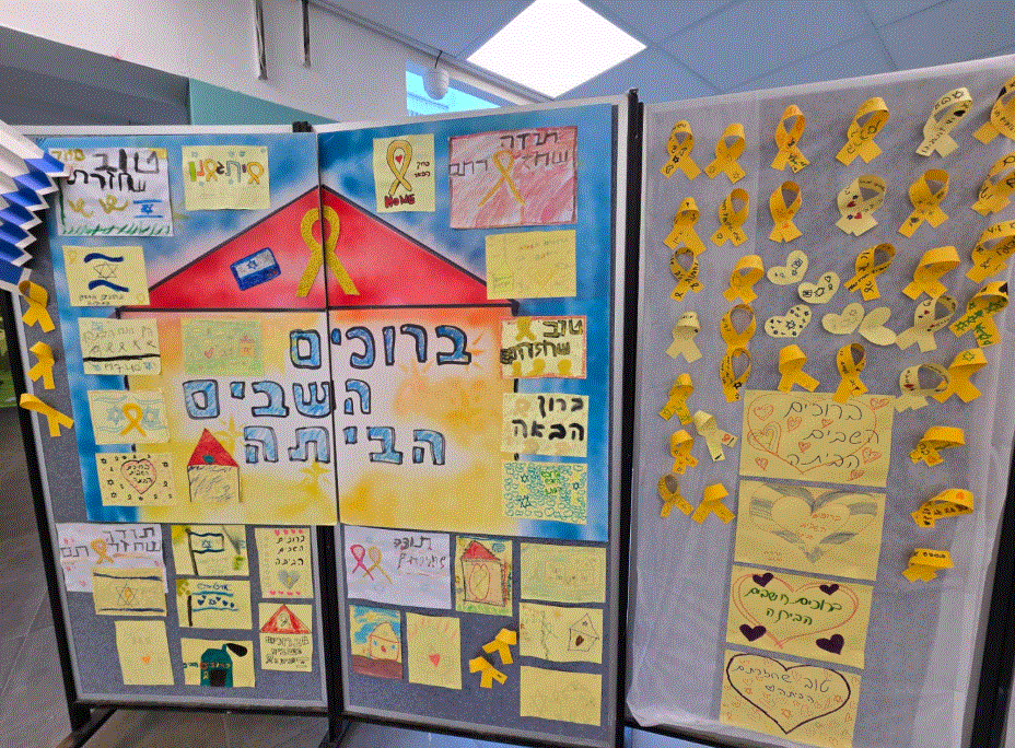 בשער בית הספר הילדים כתבו איחולים מרגשים לשבים, כמובן שלרגע אינם שוכחים את החללים ומצפים לחזרתם ולחזרתו של סמ"ר איתי חן, בוגר בית הספר​